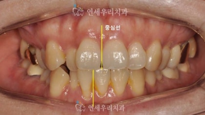 송곳니 때문에 병원에 내원하신 환자분인데 우측 상악 송곳니가 치아로 돌출되어 윗니가 전체적으로 우측으로 기울어져 있습니다.