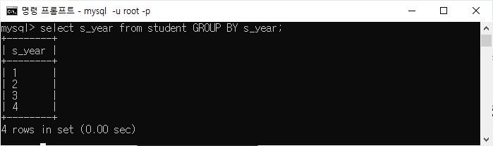| mysql> 학생 GROUP BY s_year에서 s_year 선택; |