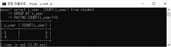 | 학생의 s_year, COUNT(s_year) 선택 s_year로 그룹화 HAVING COUNT(s_year)=3; |