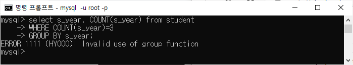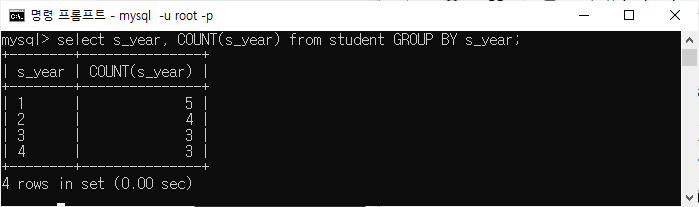 | mysql> s_year 선택, COUNT(s_year) 학생 GROUP BY s_year; |