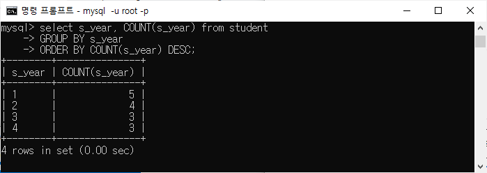 | 학생의 s_year, COUNT(s_year) 선택 s_year로 그룹화 COUNT(s_year)로 주문; |